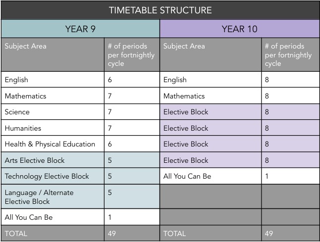 The following table gives a broad overview of the course structure for students in the middle years: